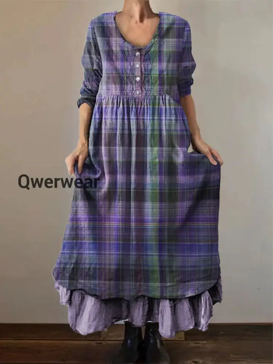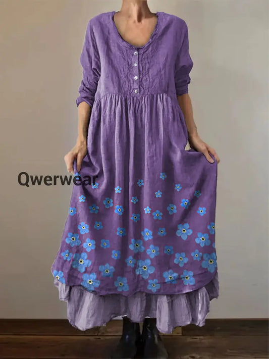 Women's Alzheimer's Awareness Purple Flower Printed Cotton Linen Long Sleeve Maxi Dress