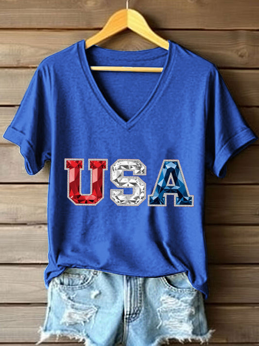 Women's USA Rhinestone Pattern V-Neck T-Shirt