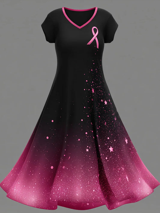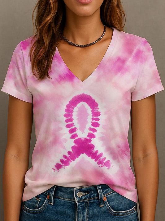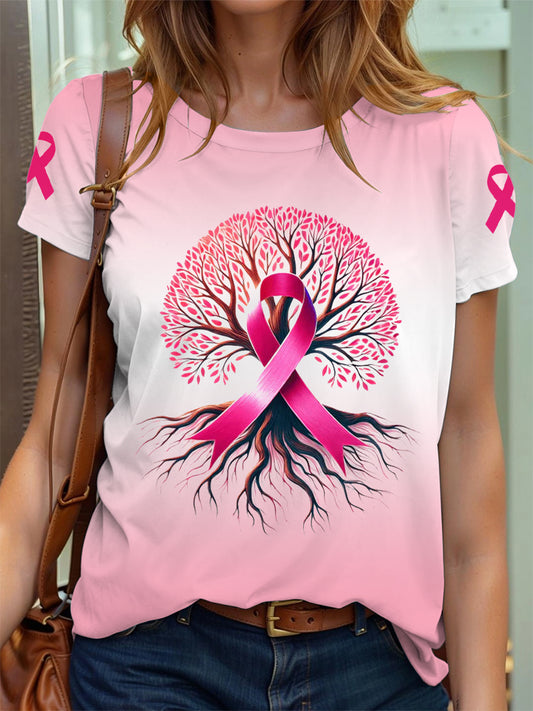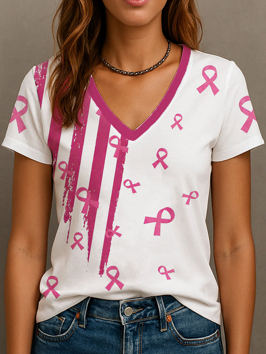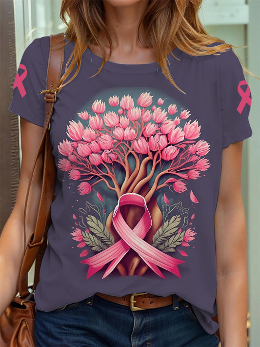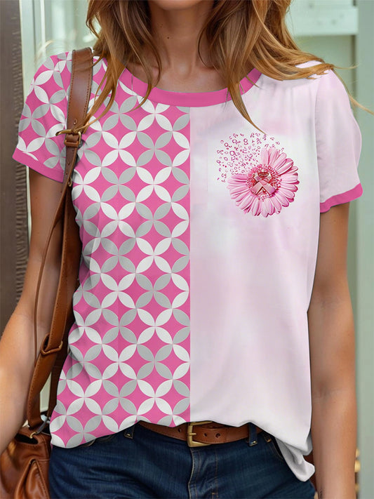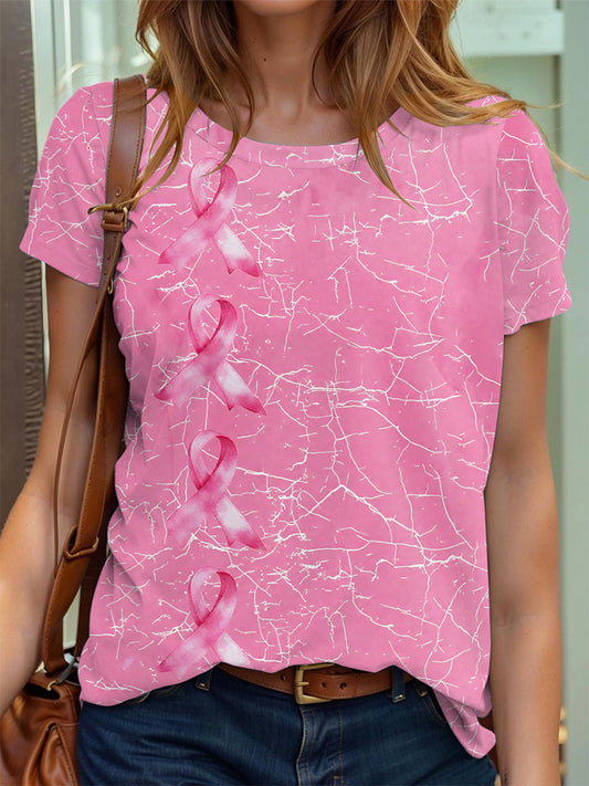 Women's Pink Ribbon and Dog Print Casual T-shirt