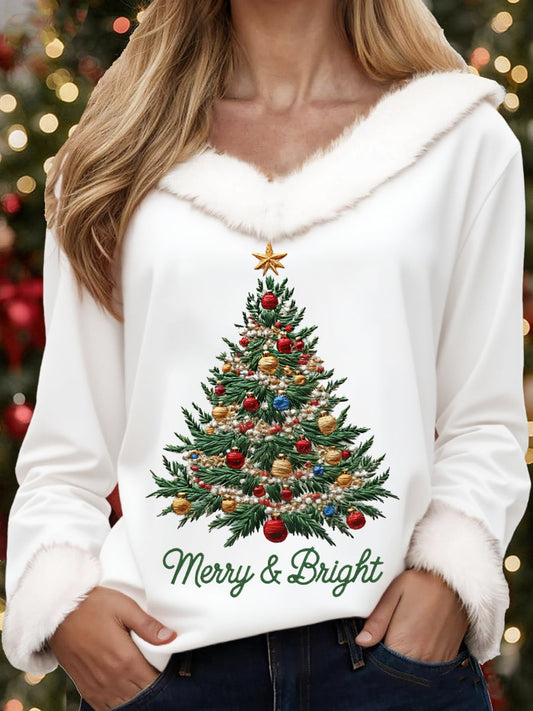 Women's Merry And Bright Christmas Tree Print Casual Fur-Collar Top