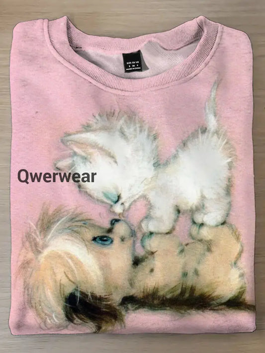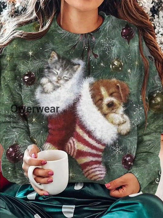 Holiday Sock Kitten Puppy Printed Crew Neck Long Sleeve Casual Sweatshirt