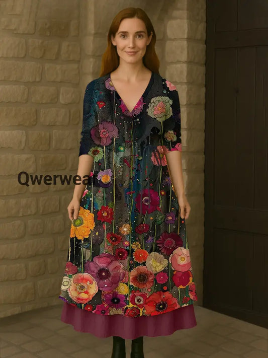 Vintage Bohemian V-Shaped Floral Art Print Casual Elegant Fashion Double Dress
