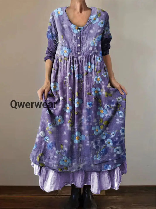 Women's Alzheimer's Awareness Purple Flower Printed Cotton Linen Long Sleeve Maxi Dress