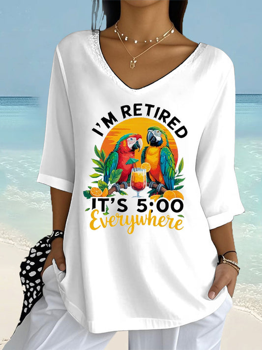 Women's I'm Retired It's 5 O'clock Everywhere Parrot Print Casual V-Neck Tee