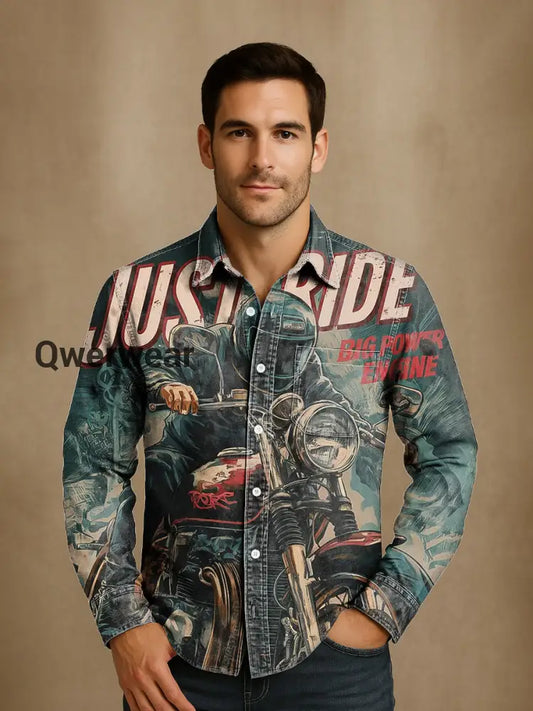 Men's Vintage Just Ride Biker Pattern Art Print Long Sleeve Pocket Shirt