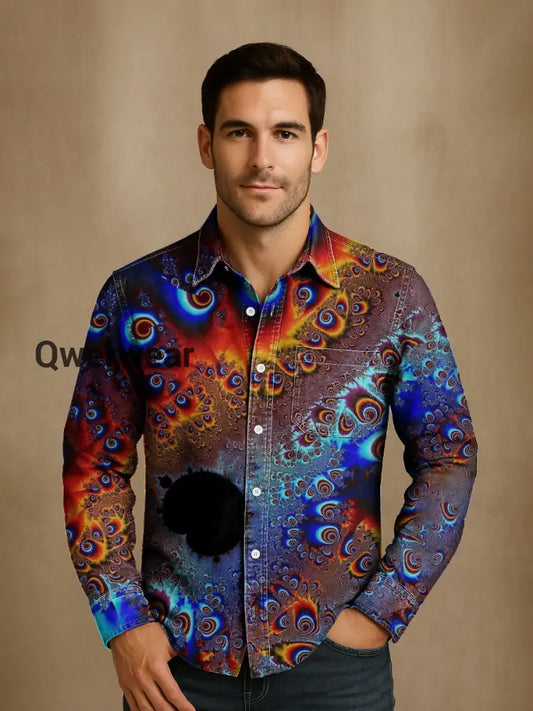 Unisex Simple Retro Fashion Colorful Art Print Lapel Long Sleeve Pocket Shirt