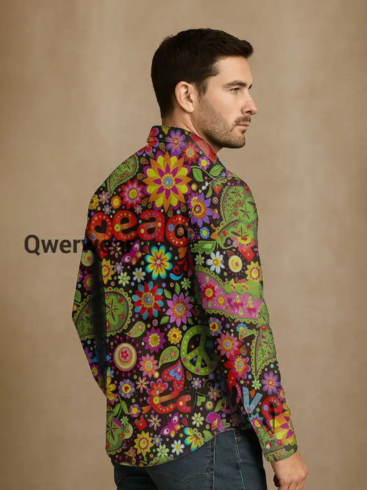 Men's Vintage Psychedelic Hippie Colorful Peace Print Casual Long Sleeve Shirt