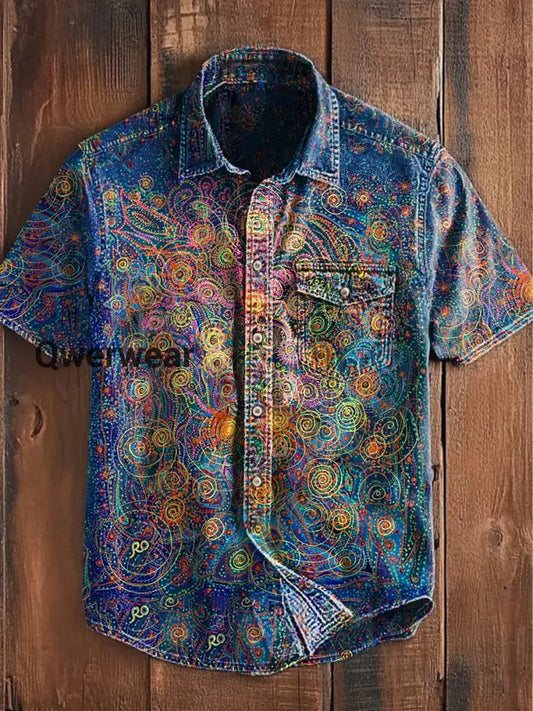 Men's Retro Abstract Art Print Short Sleeve Pocket Shirt