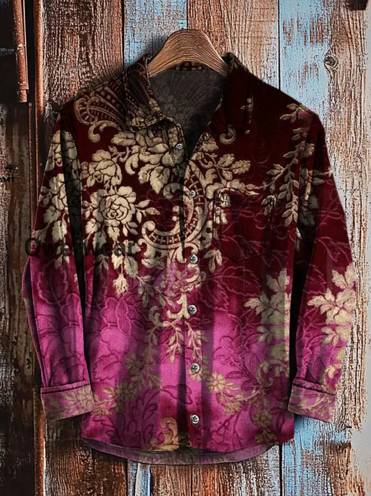 Men's Vintage Irregular Floral Art Print Long Sleeve Pocket Shirt