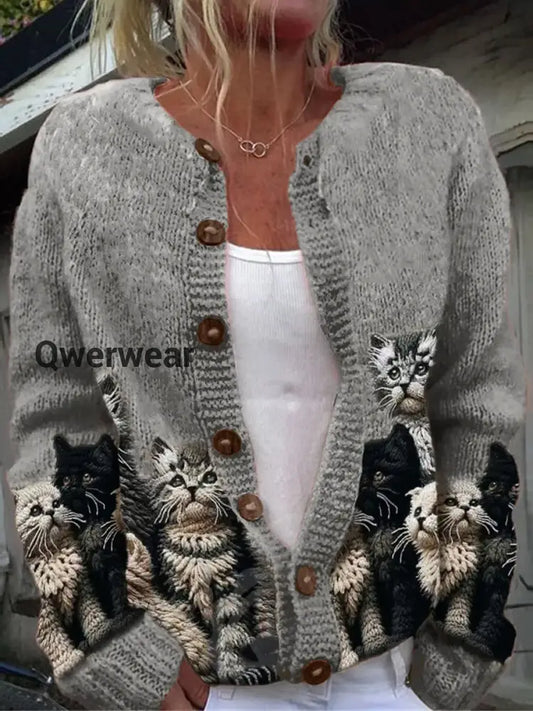 Elegant Retro Cat Print Buttoned Casual Long-Sleeved Knit Cardigan Sweater