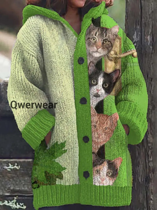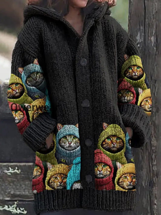 Women's Cat Pattern Casual Comfortable Knitted Hooded Cardigan