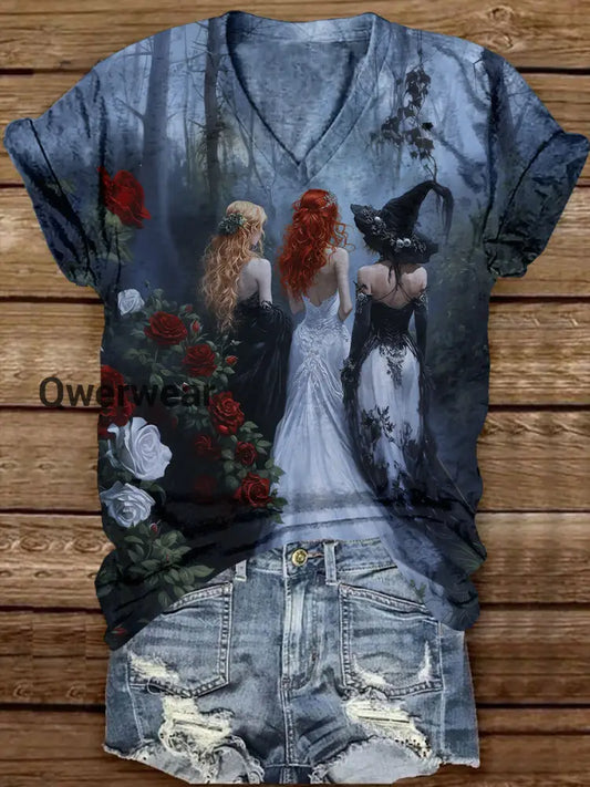 Witch Art Print Unisex V-Neck Casual T-Shirt