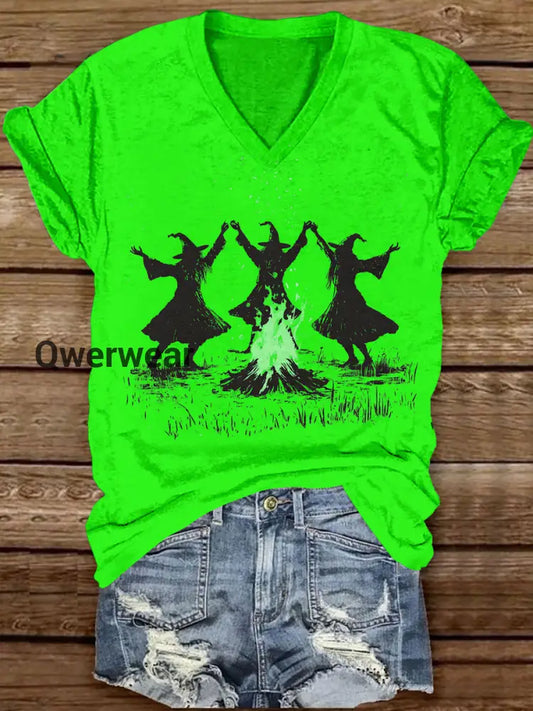 Witch Bonfire Ceremony Dance Art Print Unisex V-neck Short Sleeve Casual T-shirt