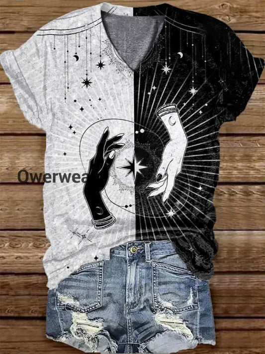 Unisex Tarot Card Divination Pattern Casual V-Neck Short Sleeve T-Shirt