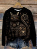 Black Cat Folk Art Print Crew Neck Long Sleeve Casual Sweatshirt