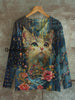 Cat Art Print Unisex V-Neck Long Sleeve Casual T-Shirt