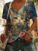 Cat Flower V-Neck Short Sleeve T-Shirt