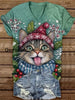 Christmas Fun Cat Art Print Unisex V-Neck Short Sleeve Casual T-Shirt