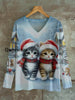 Cute Cat Christmas Print Unisex V-Neck Long Sleeve Casual T-Shirt
