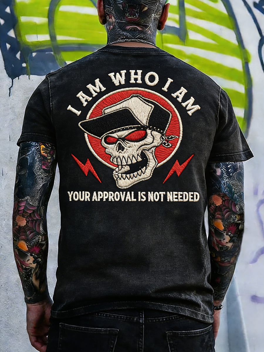 Men's I Am Who I Am Your Approval Is Not Needed Embroidery Pattern Washed T-Shirt