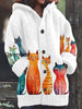Vintage Cat Art Print Button Thick Long Sleeve Hooded Cardigan