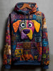 Vintage Halloween Patchwork Dog Print Art Casual Hoodie