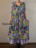 Women's Alzheimer's Awareness Purple Flower Printed Cotton Linen Long Sleeve Maxi Dress