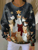 Women's Christmas cat Ribbed Round-Neck Sweatshirt