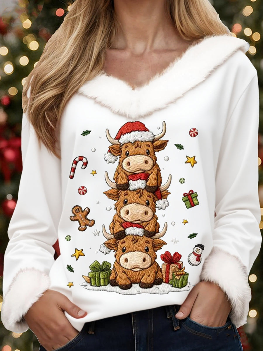 Women's Christmas Cute High Land Cow Print Casual Fur-Collar Top