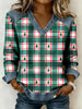 Women's Christmas Plaid Pattern Patchwork Art V-Neck Top