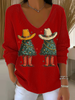 Women's Christmas tree Print V-Neck Ribbed Top
