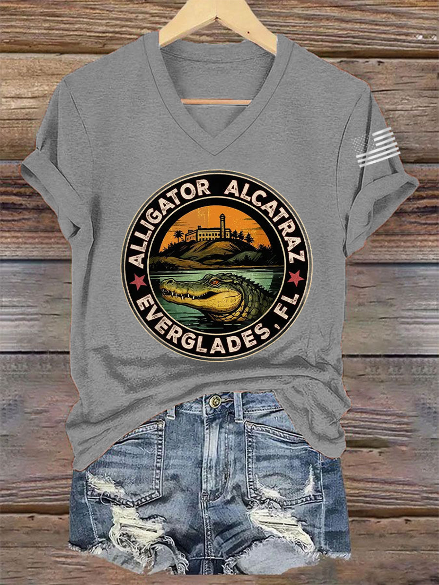 Women's Retro Alligator Alcatraz Funny Florida Everglades Dark Humor V-Neck Tee