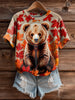 Women's Vintage Autumn Fallen Thanksgiving Bear Print Art Cozy Knit Top